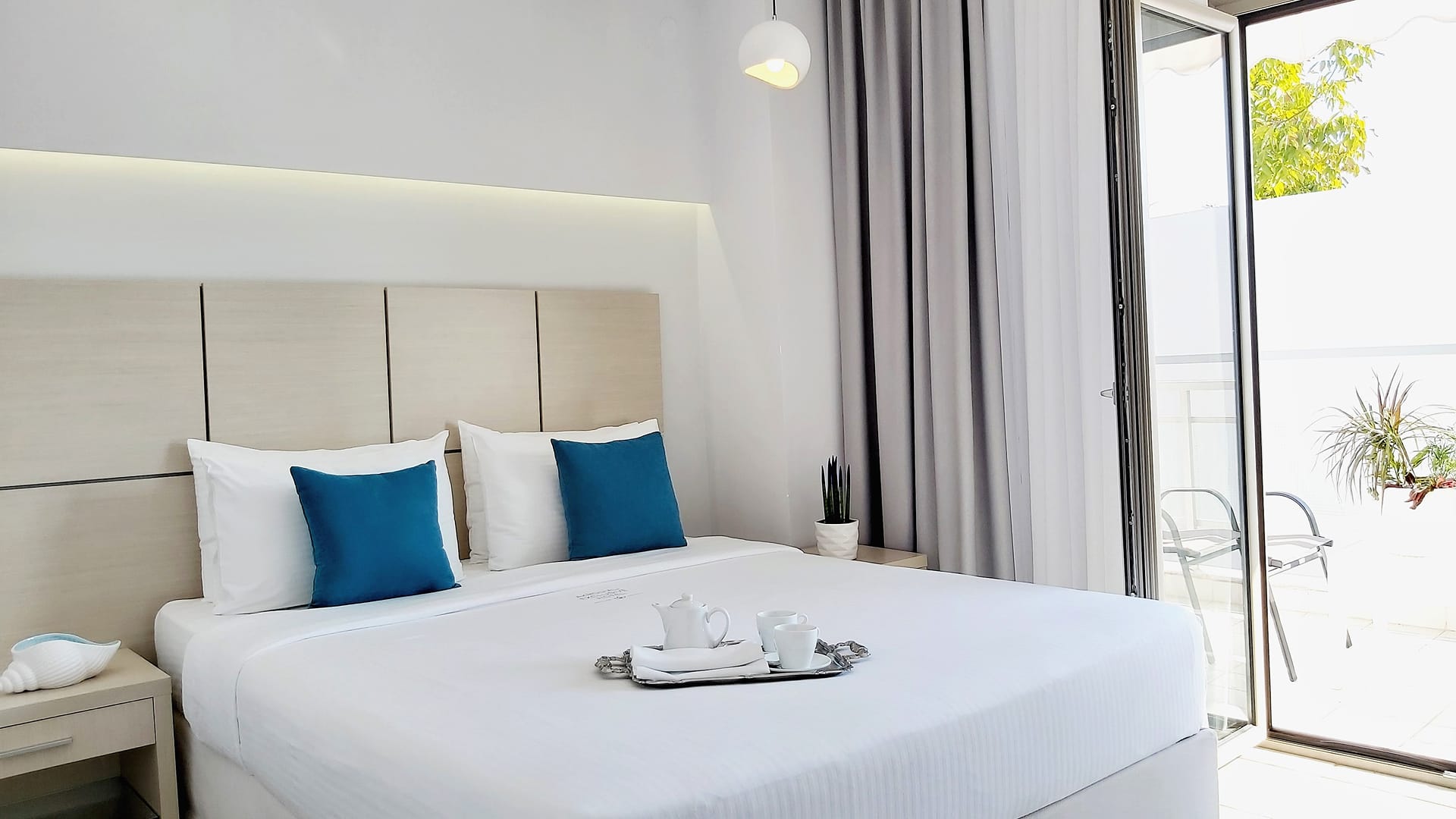 Classic Double Room: This room offers a place of tranquility in a true Greek style, a balcony over the quiet inner courtyard and are designed with therapy soft colours and LED lighting. The classic room provides queen size bed with new mattresses with the quality signature of pocket spring and a design bath with fine porcelain. Special Amenities of the room include: -free high speed WiFi -mini fridge -safe -tea making facilities -double-glazed windows -individually controlled air conditioning -flat-screen satellite TV -electronic door lock -daily maid service -personalized check-in. Please note that this room type cannot accommodate an extra guest or child.